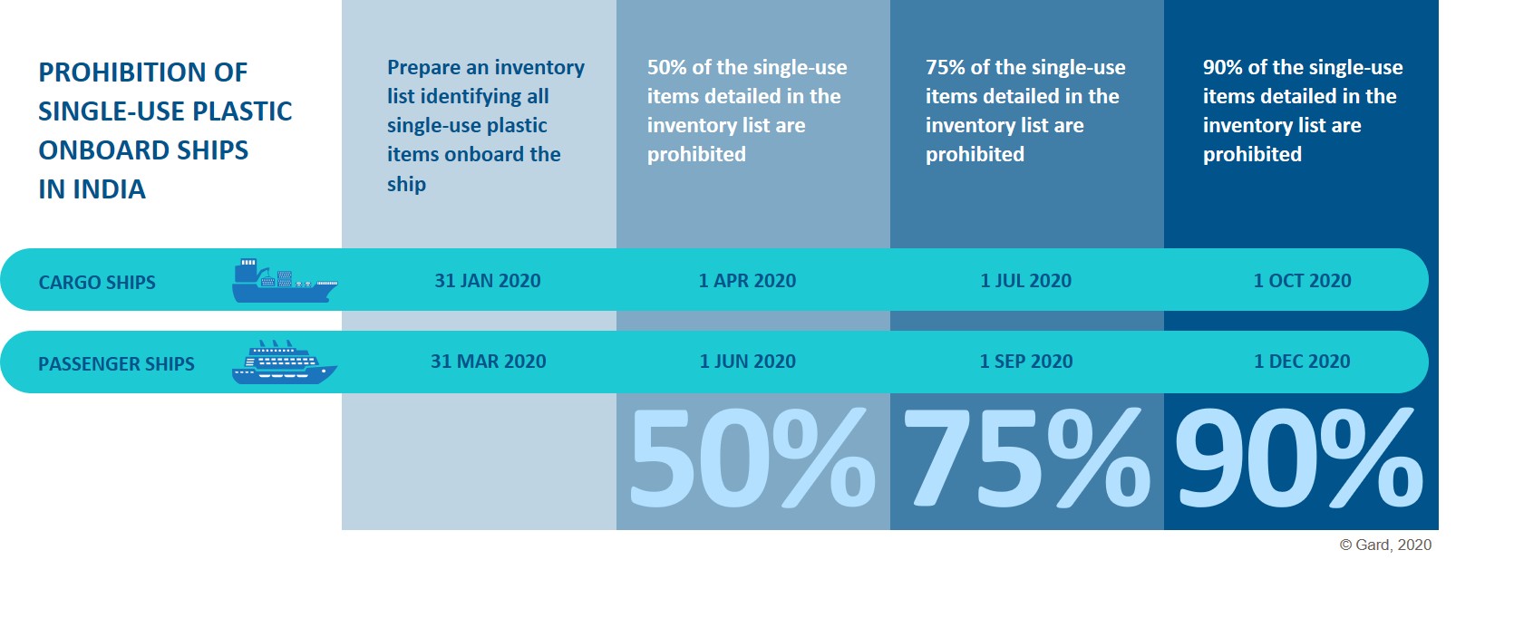 All ships are eventually required to reduce their single-use plastic use by 90% during stays in Indian ports. This will be achieved by a stepwise implementation of the prohibition and will be based on ship type and each ship’s actual inventory of single-use plastic items. To summarise: