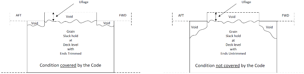 In the practice of loading ships with grain, a loading condition is frequently observed where a compartment is "specially suitable" as defined in A 2.7, filled up to or above the bottom edge of the hatch end beams but not to the highest possible level in way of the hatch opening. The condition where the grain cargo is slacked in the coaming of a "specially suitable compartment" with the ends being trimmed according to A 10.6 is illustrated below to the left. The same condition with the ends untrimmed (illustration to the right) is not covered by the current Code and cannot be calculated for stability purposes in an accurate fashion. This condition often arises unintentionally due to variations in cargo stowage factor, or operational and voyage order constraints.