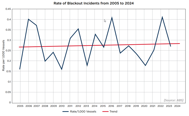 Realistic accident statistics for blackouts on ships are difficult to obtain because most blackouts are probably not reported as “accidents”. However, there seem to be some indications of an increase in event frequency. The figure below is created by the classification society American Bureau of Shipping (ABS) and shows a rising trend in the rate of reported blackouts in the world maritime fleet between 2005 and 2024. Similarly, research by Det Norske Veritas (DNV)found that in 2019, the media reported 12 power loss events on cruise ships that resulted in full or partial blackout while in transit or manoeuvring, a significant increase from four events in the previous year.