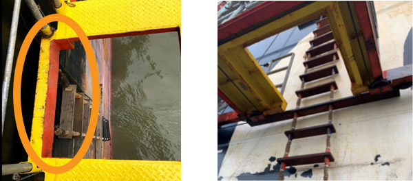 A pilot ladder hanging from a cross beam near the bottom of the platform (see image on the left below) is a typical example of an unsafe transition through the trapdoor arrangements reported by various pilot associations:
