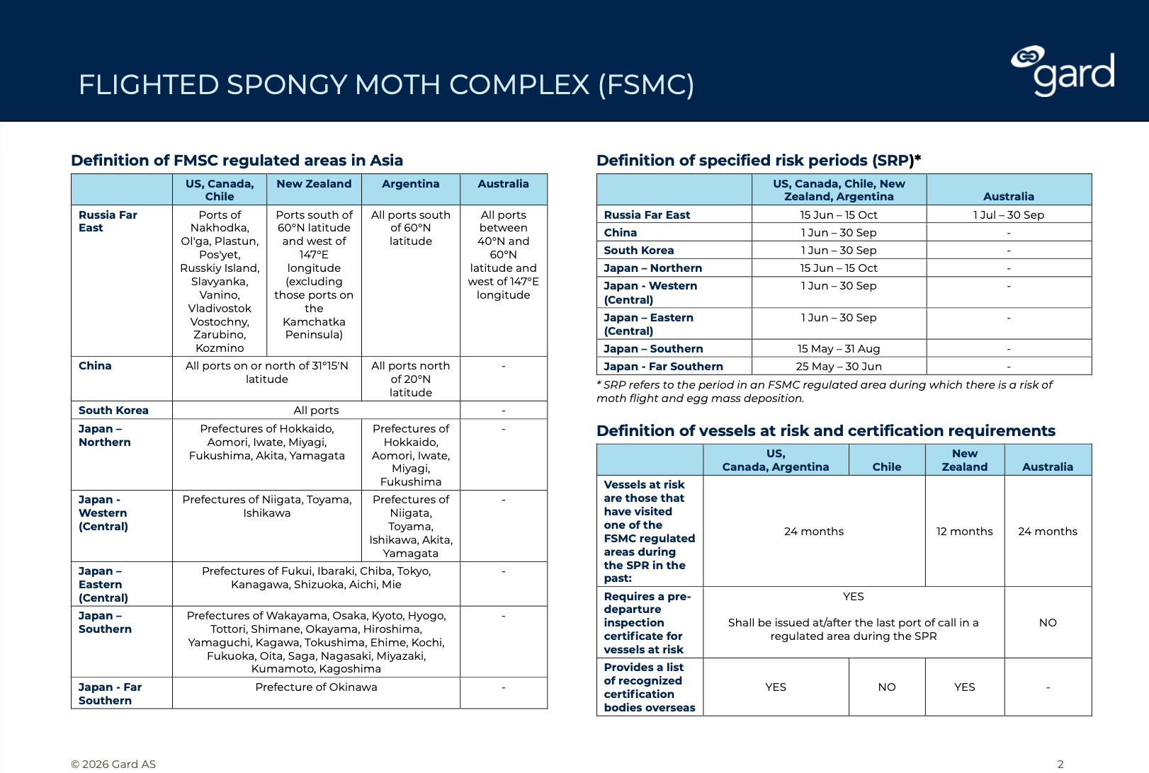 All countries known to enforce FSMC measures require arriving vessels to declare whether they have visited regulated ports in Asia during specified risk periods (SRP), when the likelihood of egg mass deposits is high. Most also require such vessels to be inspected and certified free of FSMC by a recognized certification body. However, requirements and port-of-entry procedures still differ between countries, and even the definitions of regulated areas and the timing of SRPs in Asia are not fully aligned.