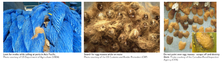 Canada and the US work together to manage FSMC risks, aligning their policies on FSMC regulated areas and SRPs with the most recent recommendations by NAPPO. Vessels that have called at a port in a regulated area during the SRP within the past 24 months must arrive at North American ports free of FSMC and should have obtained pre-departure certification from a recognized overseas inspection and certification body. In addition to certification, vessels are requested to exercise extra vigilance through self-inspections during the voyage to prevent arriving with egg masses.