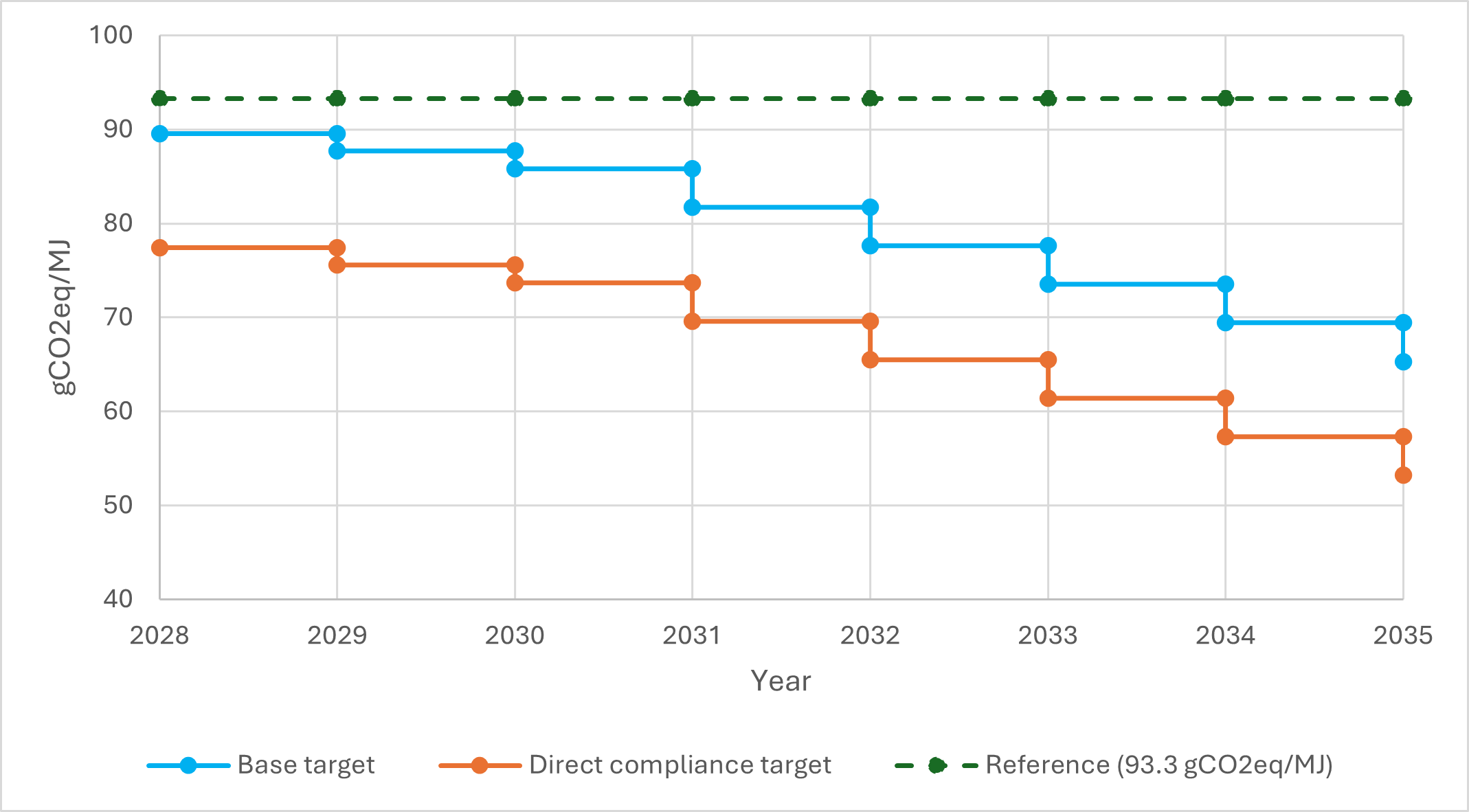 The measures will start from 1 January 2028 and apply to vessels of 5,000 gt or above.. There are two reduction trajectories: the more modest ‘Base’ target and the more ambitious ‘Direct Compliance’ target. These measures are intended to align with the IMO’s ‘base’ and ‘striving for’ GHG reduction targets