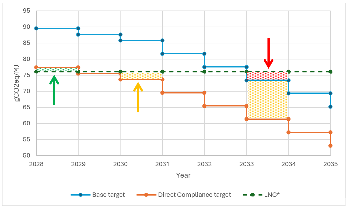 The financial consequences of compliance or non-compliance can be illustrated by the example of a vessel operating on LNG in the period 2028-2035, with an Attained GFI/ GHG intensity figure of 76.1gCO2eq/MJ.